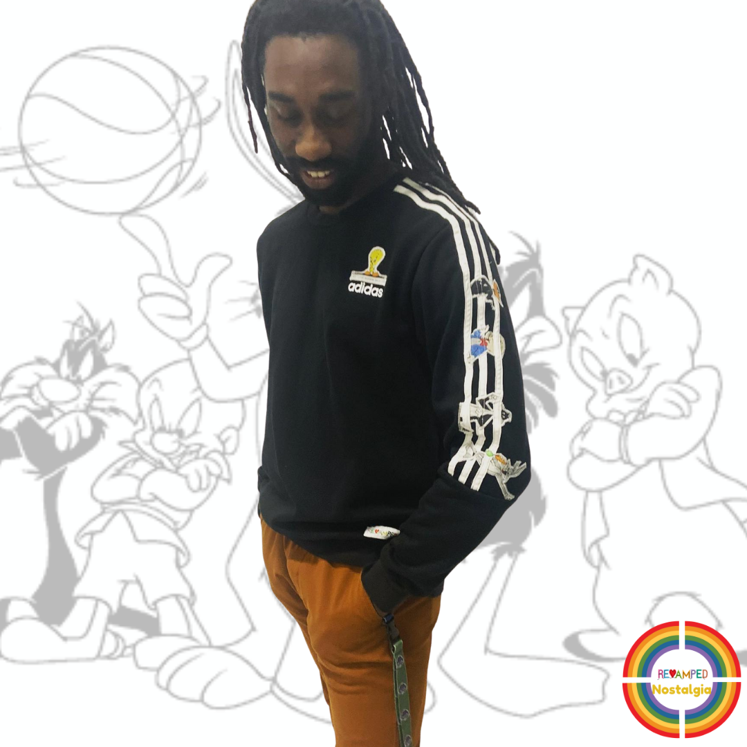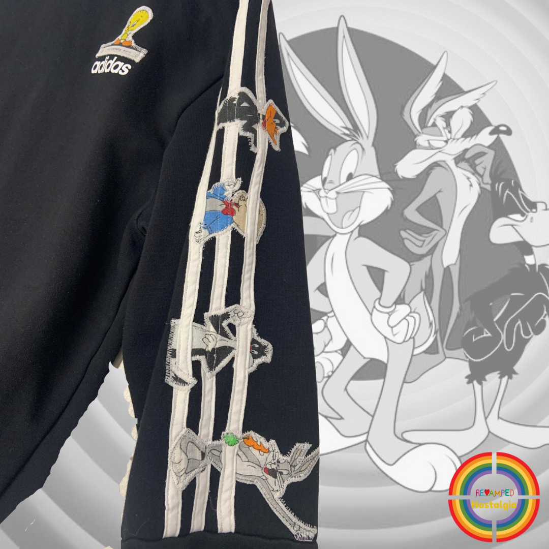 Handmade patches from vintage Looney tunes fabric; expertly appliqued in between the iconic adidas 3 stripes on the left arm of this pull over.