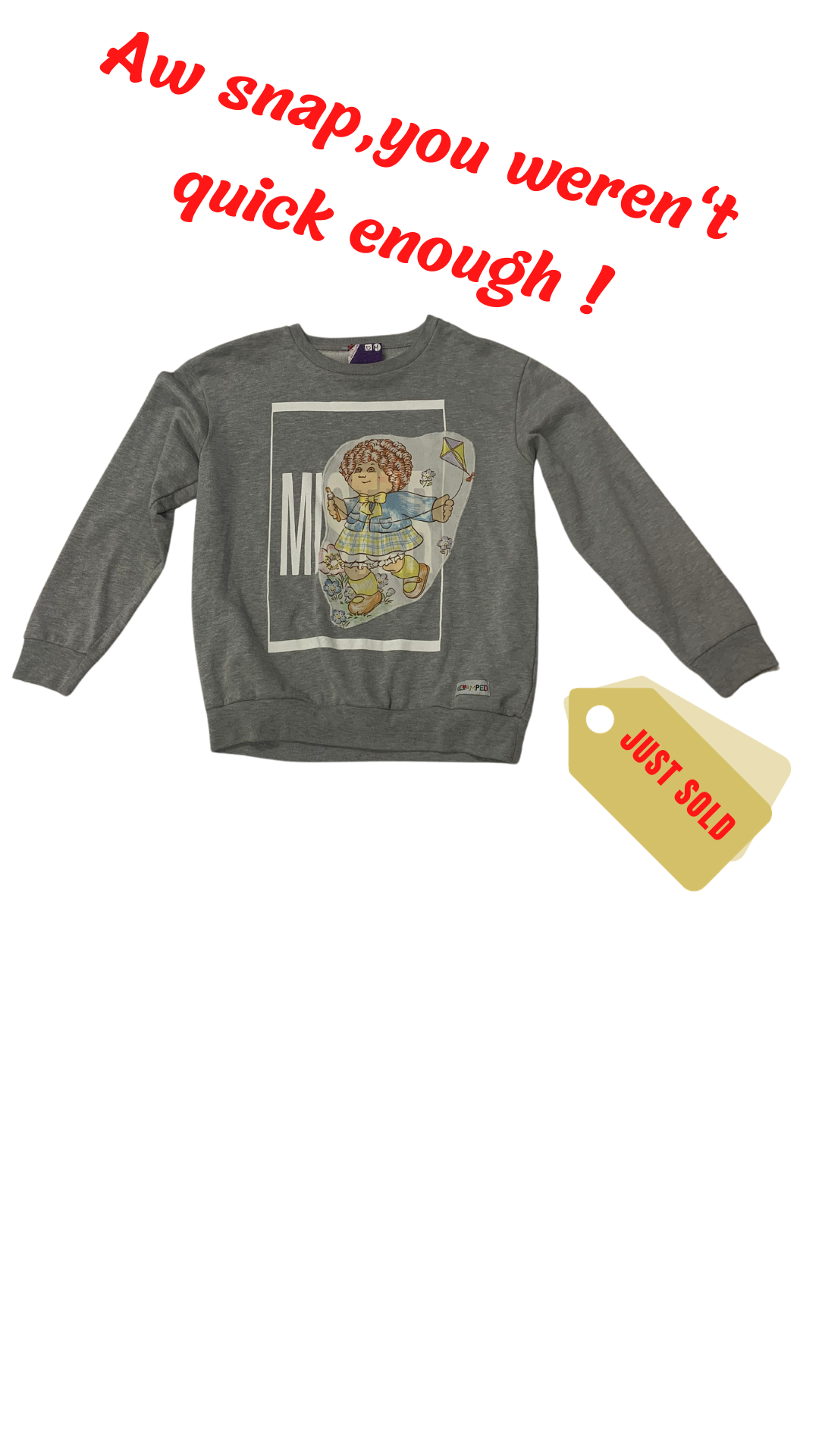 I’ve created a Cabbage Patch patch , using vintage (1982) fabric featuring a curly haired cutie flying a kite! The word Mister protrudes slightly exposing the previous life of this gently used heather grey pullover .