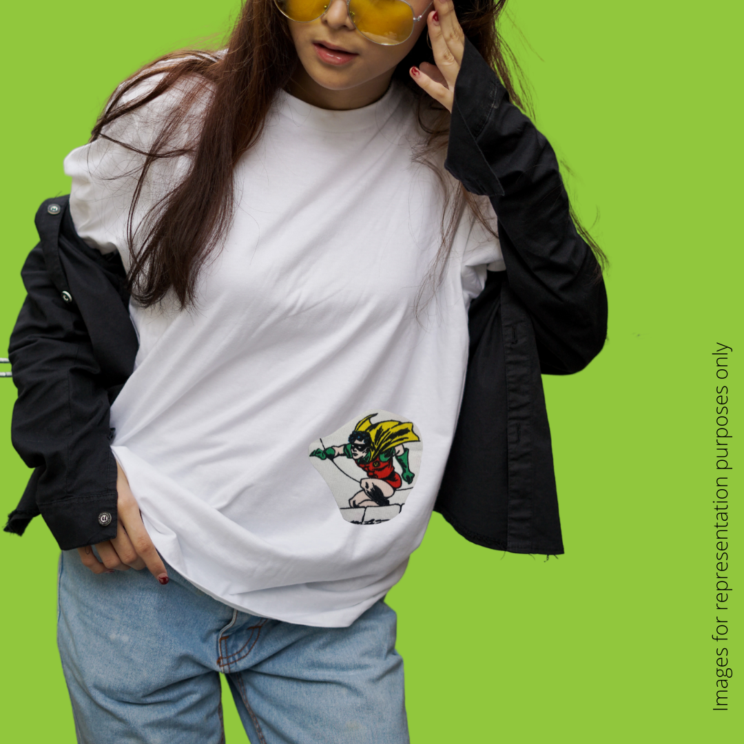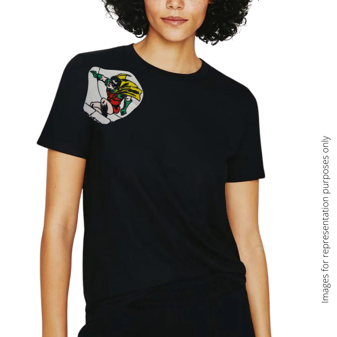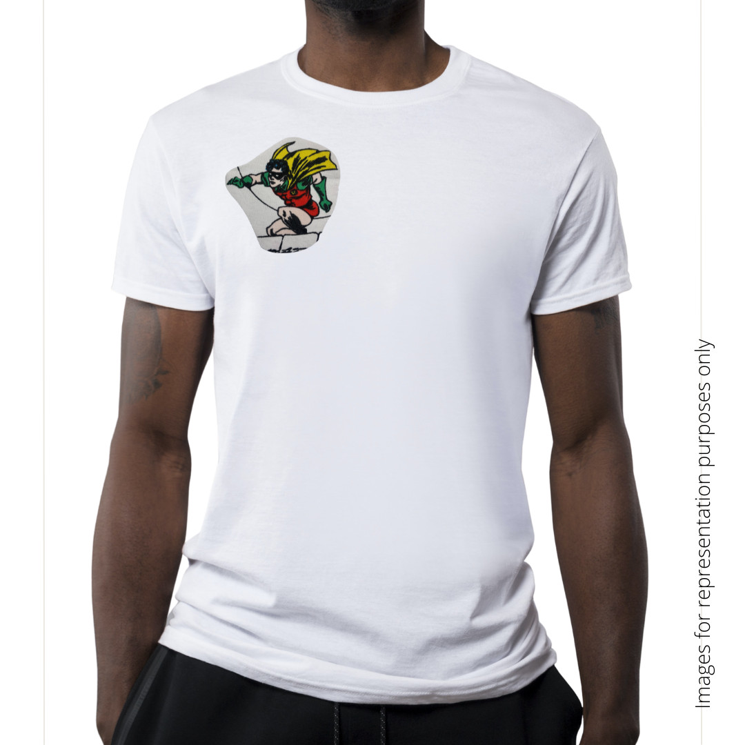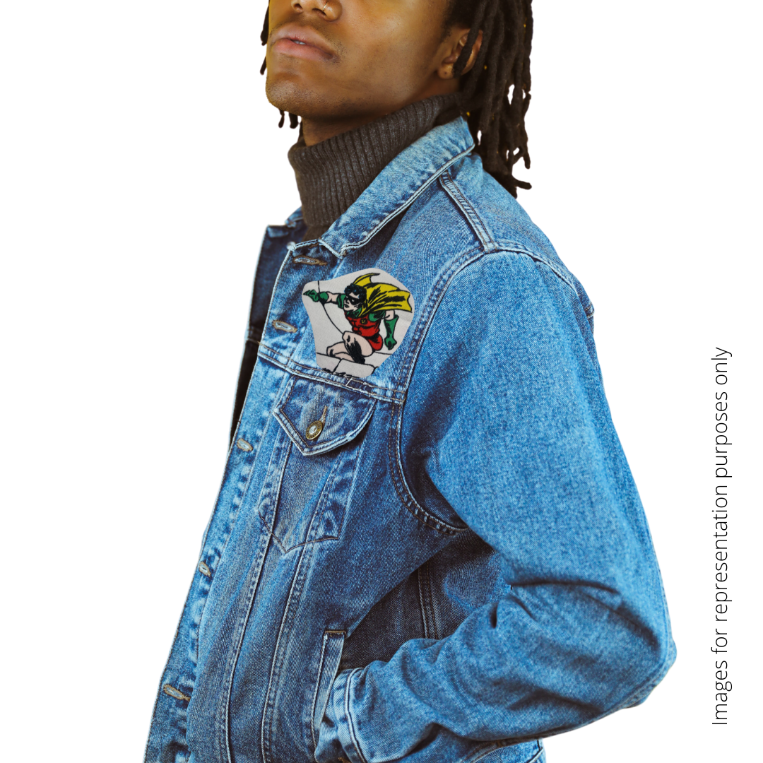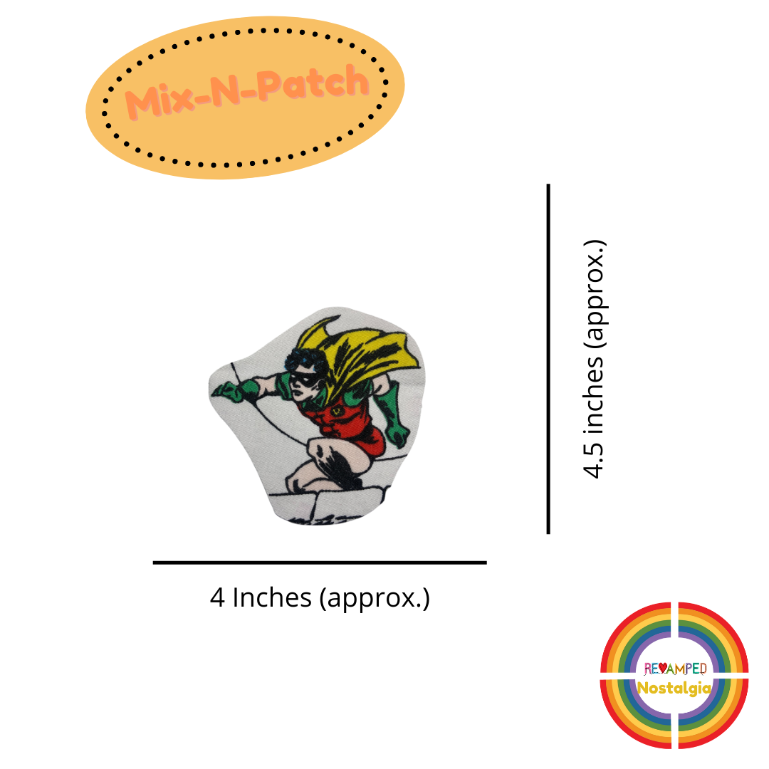 Dick Grayson AKA Robbin patch made from vintage Batman fabric. Choose just the patch, or have it sewn on a Black or white shirt of your size.