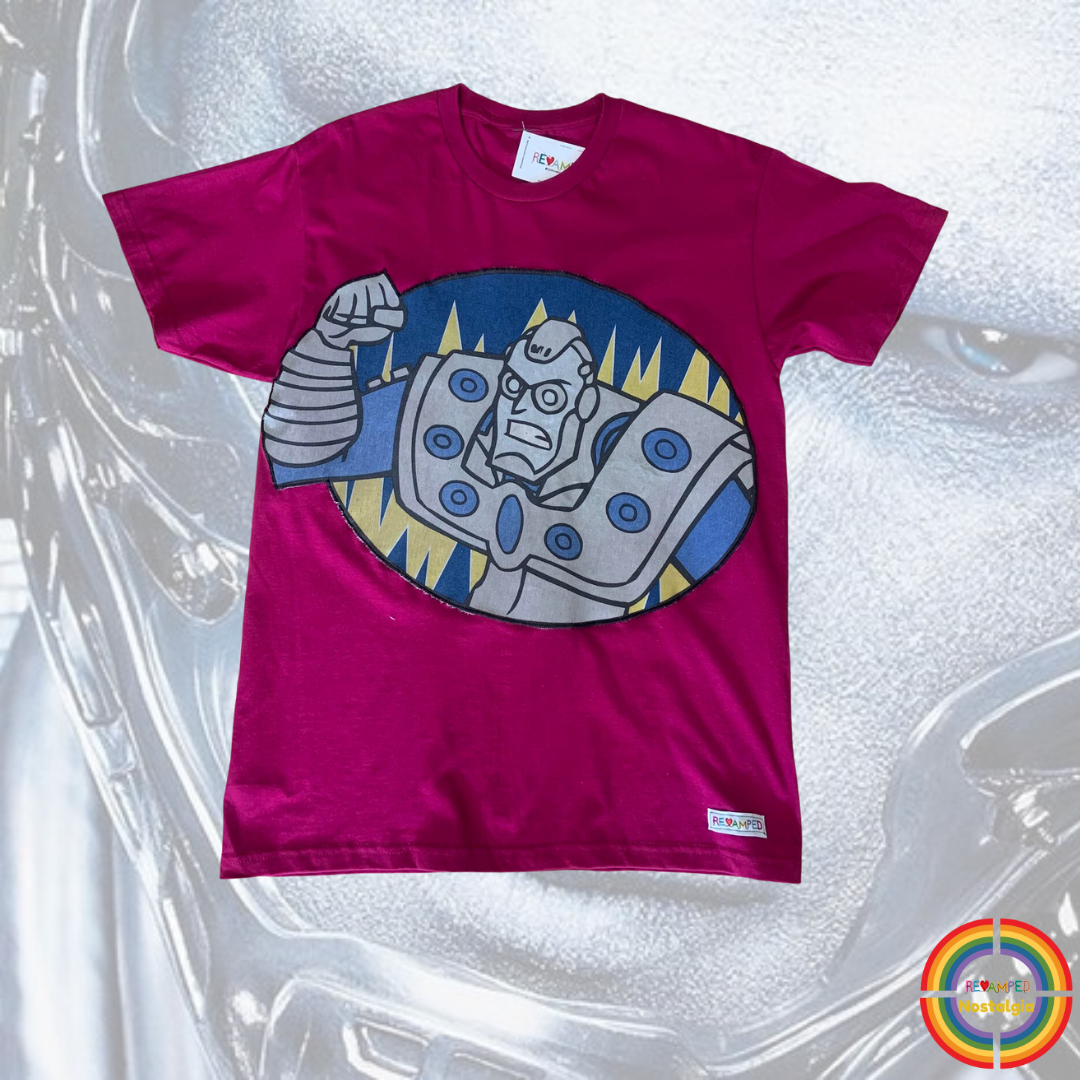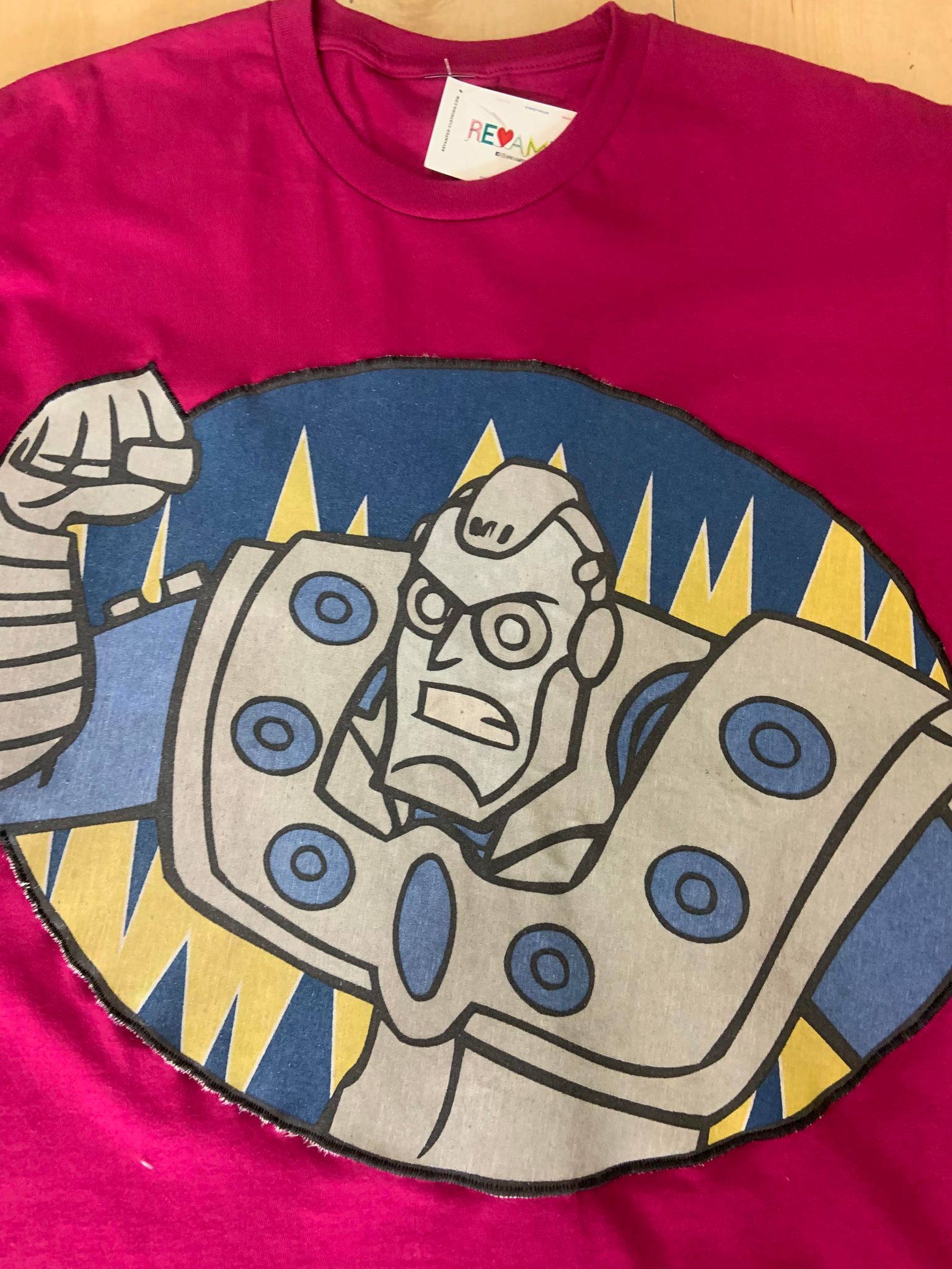 This DR.FREEZE berry coloured t-shirt features a handmade applique crafted with vintage 1996 Batman fabric. It's available in size Large .Enjoy the comfort and style of this unique one-of-a-kind shirt.