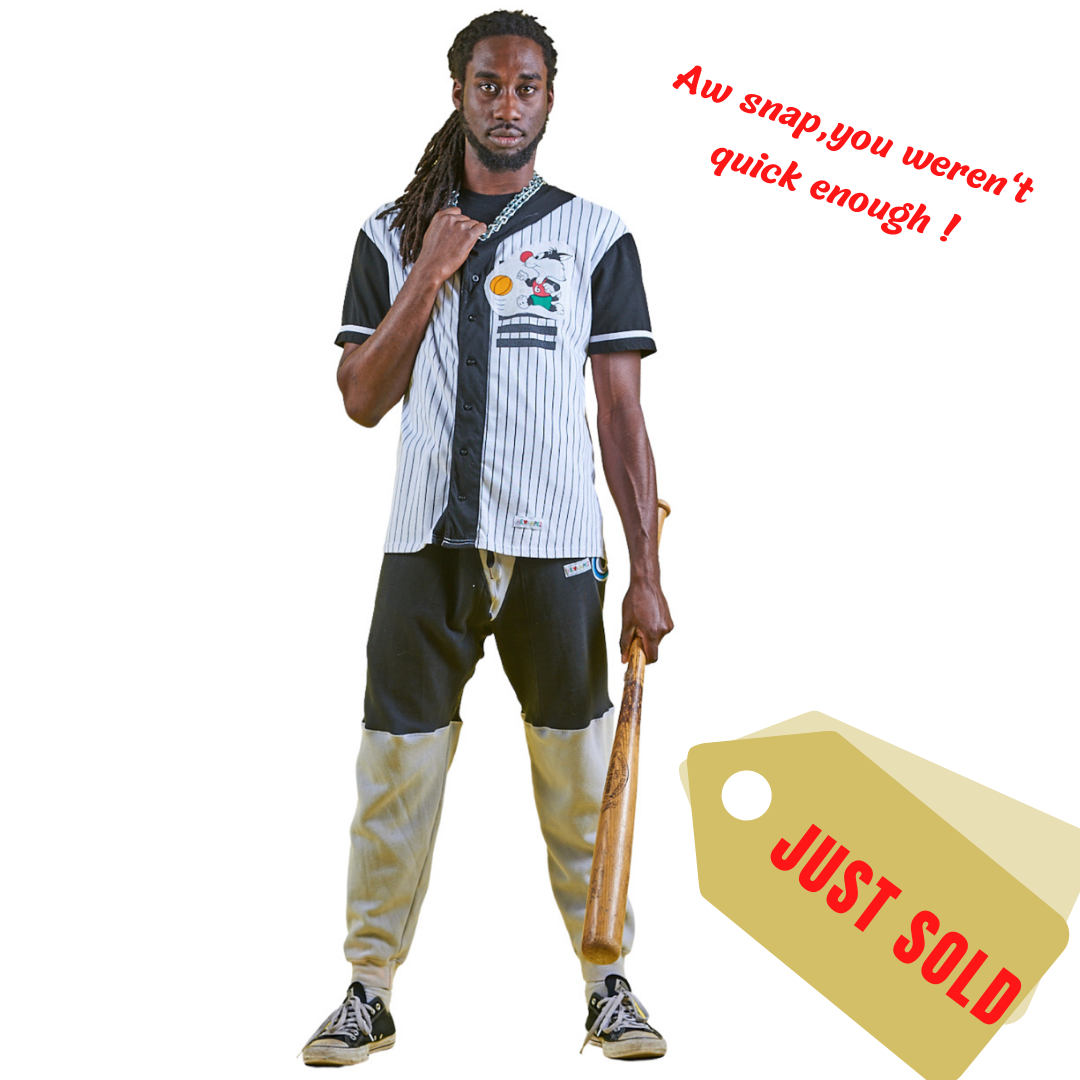 Previously loved black and white pinstripe baseball tee features handmade patches from vintage "Sylvester " and son playing various sports. Game on in deed.