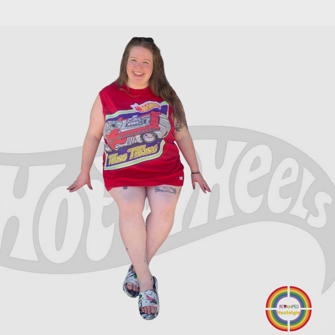 Red tank Features handmade giant " hot wheels" patch on the chest, made from vintage hot wheels fabric. It's a twang thang.