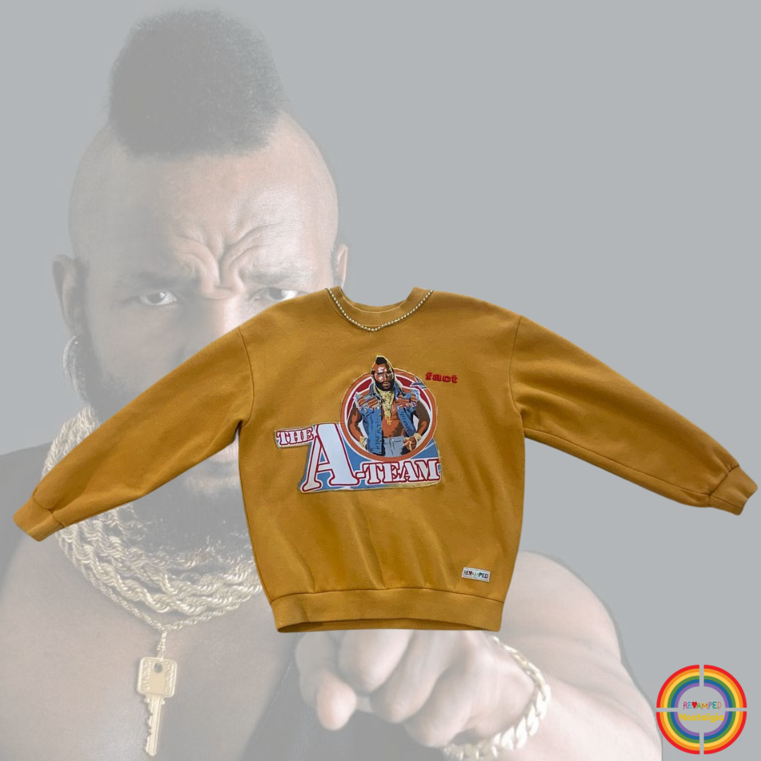 Previously loved Mustard "fact" sweater embellished with a handmade "The A team" patch made from vintage "A team" fabric... that's a fact!