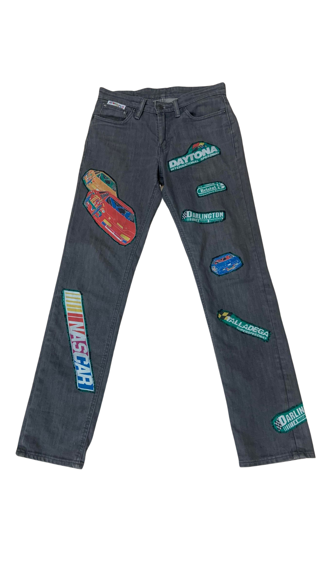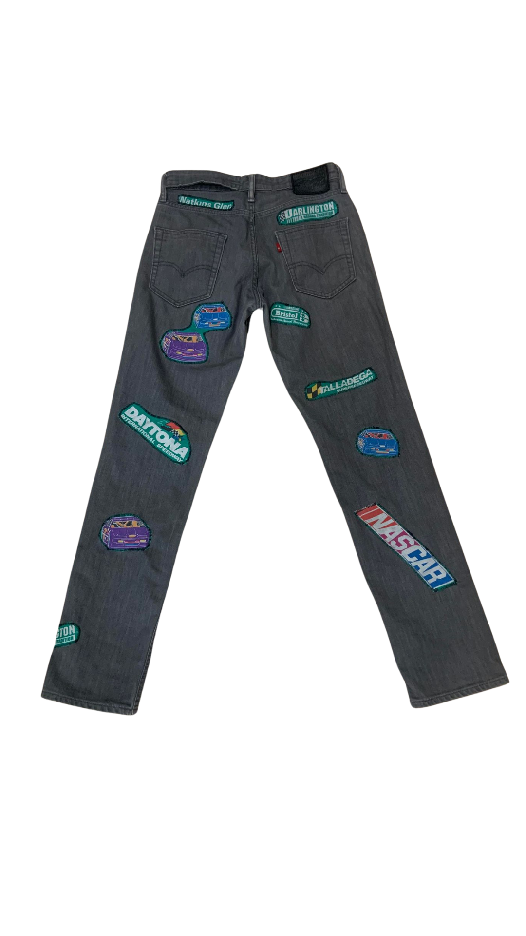 These 'NASCAR' jeans are more than just a stylish pair of grey "Levi's" denim. This pair is uniquely embellished with handmade patches made from vintage "Nascar" fabric, giving them a touch of history and character. Perfect for any racing fan . Vroom Vroom!!