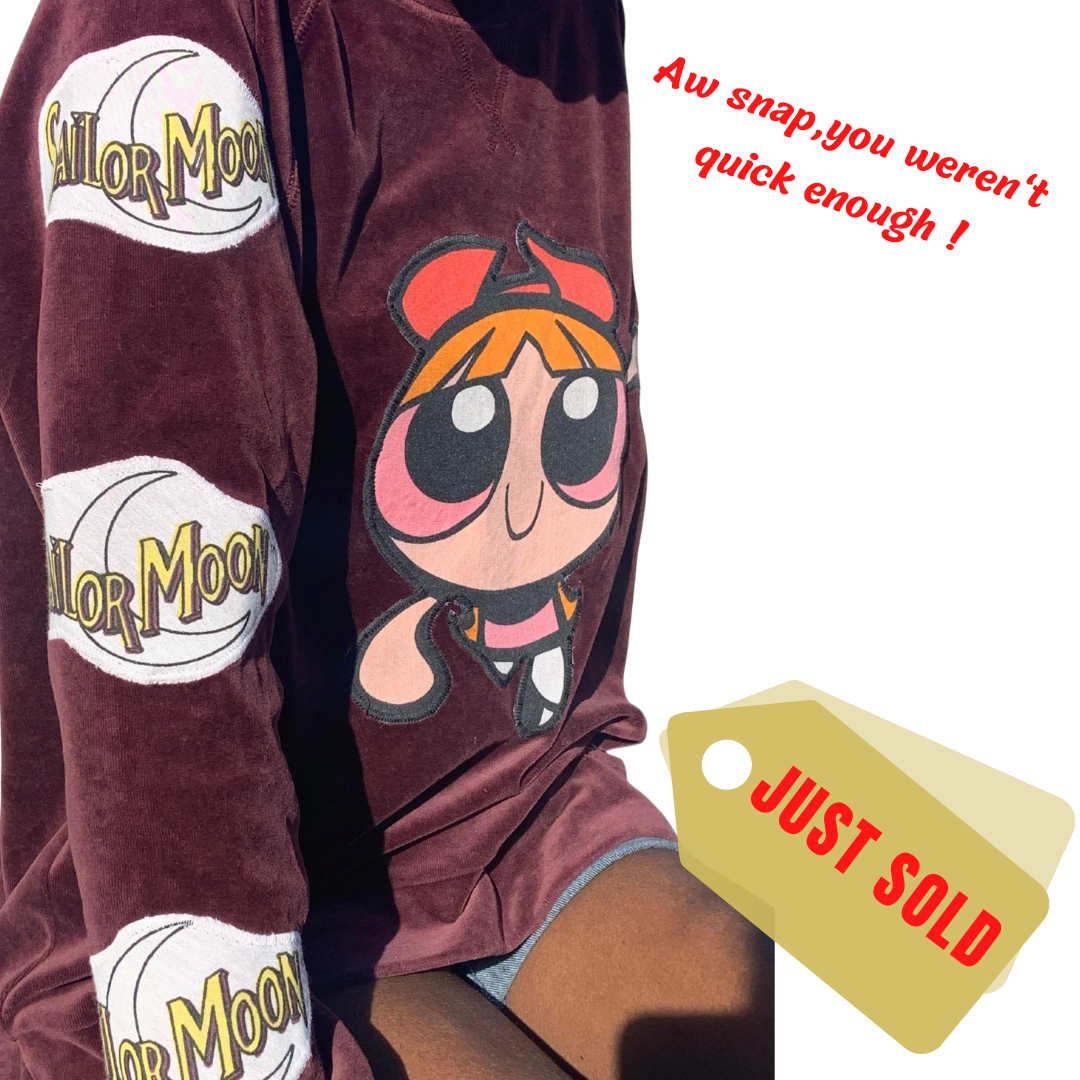 Featuring handmade patches from vintage Sailormoon and "Blossom" , of the Power Puff Girls fabric.