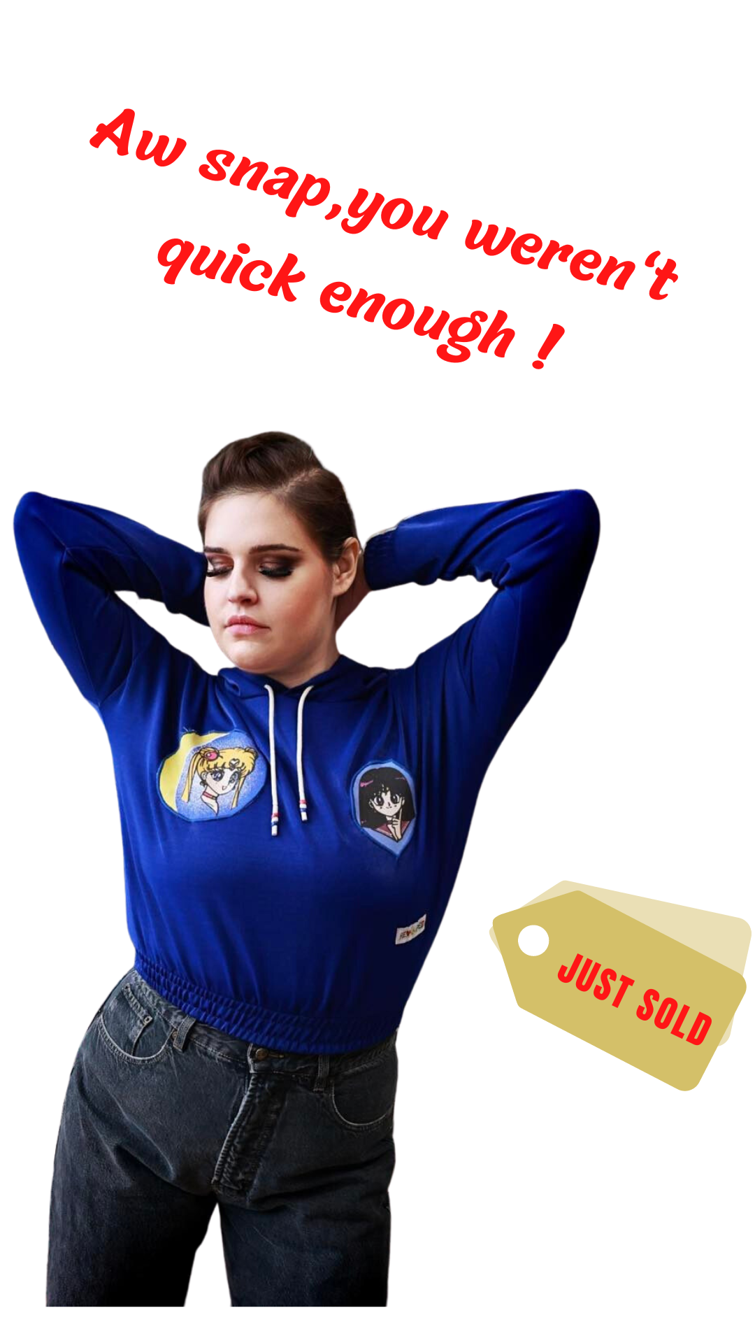 Bright blue previously loved hoodie ft. white stripes on down the sleeves, blue and read beaded drawstring and two handmade patches made from vintage “Sailormoon” fabric.