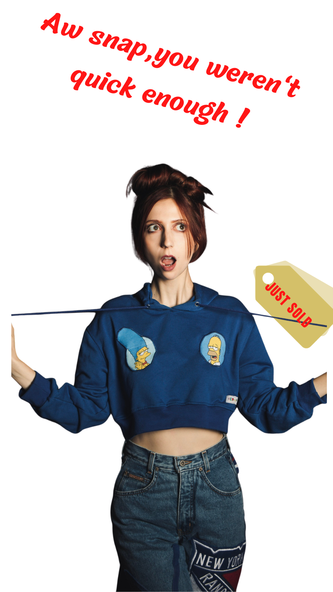 Cobalt blue cropped hoodie featuring handmade Marge and Homer Simpson patches made from vintage "The Simpsons" Material, on the chest.