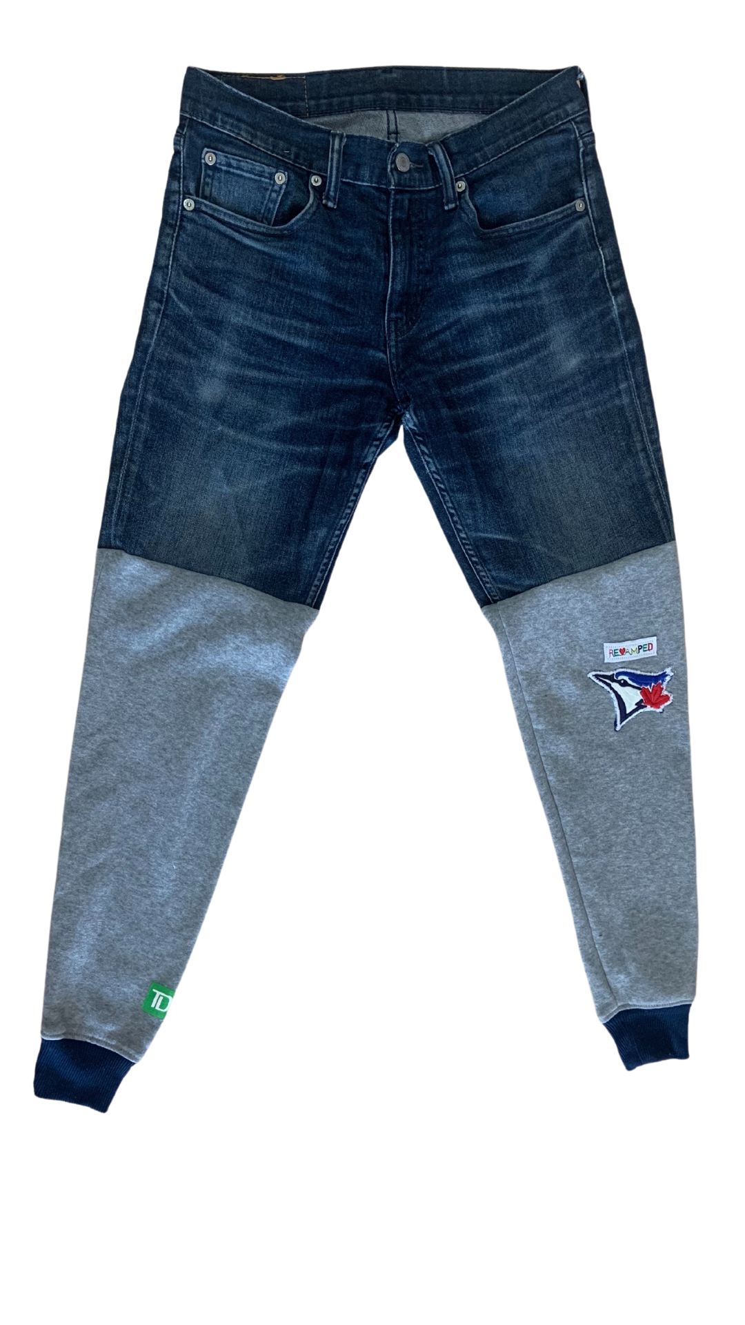 Previously loved 'Levi's" dark wash jeans combined with a hoodie , accented with a Toronto Bluejays logo.