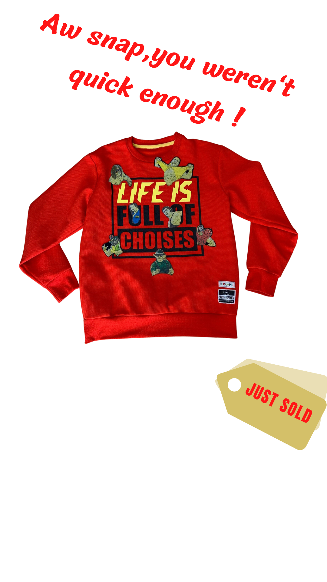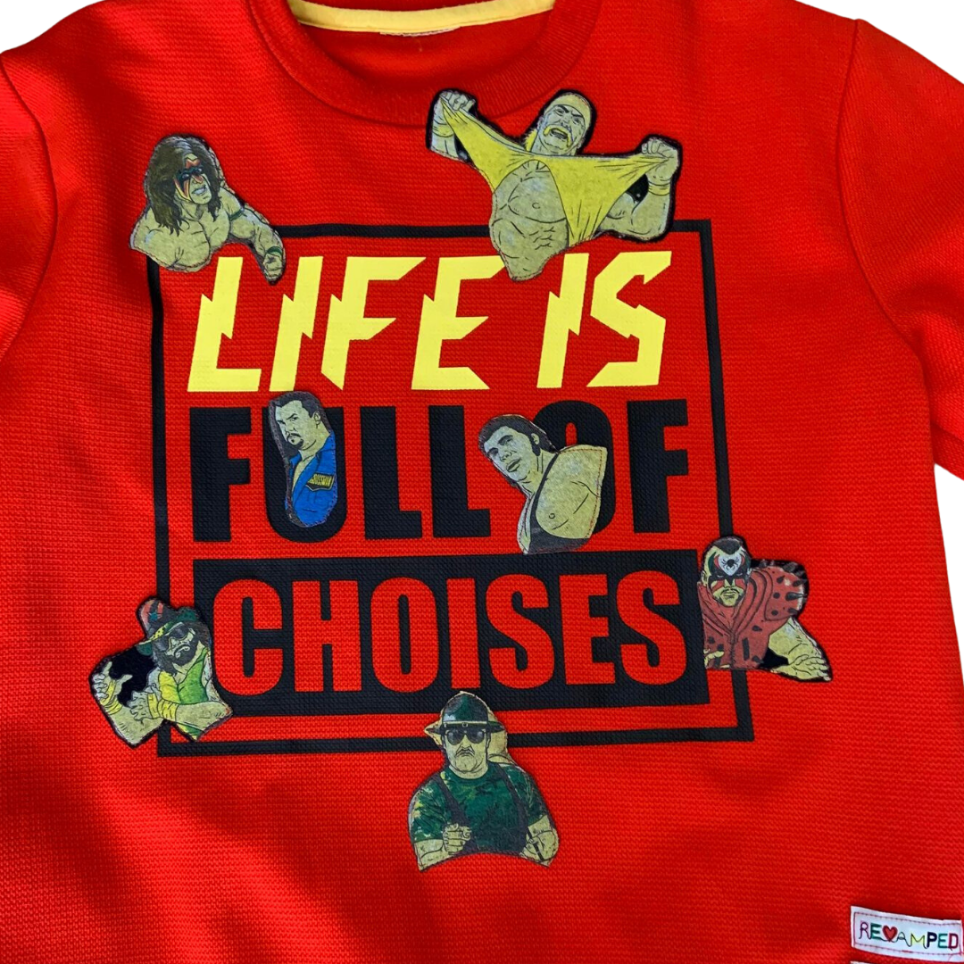 Couldn't have said it better myself! Previously loved red pullover ft. Handmade patches of some of the G.O.A.T.S' wrestling has to offer.