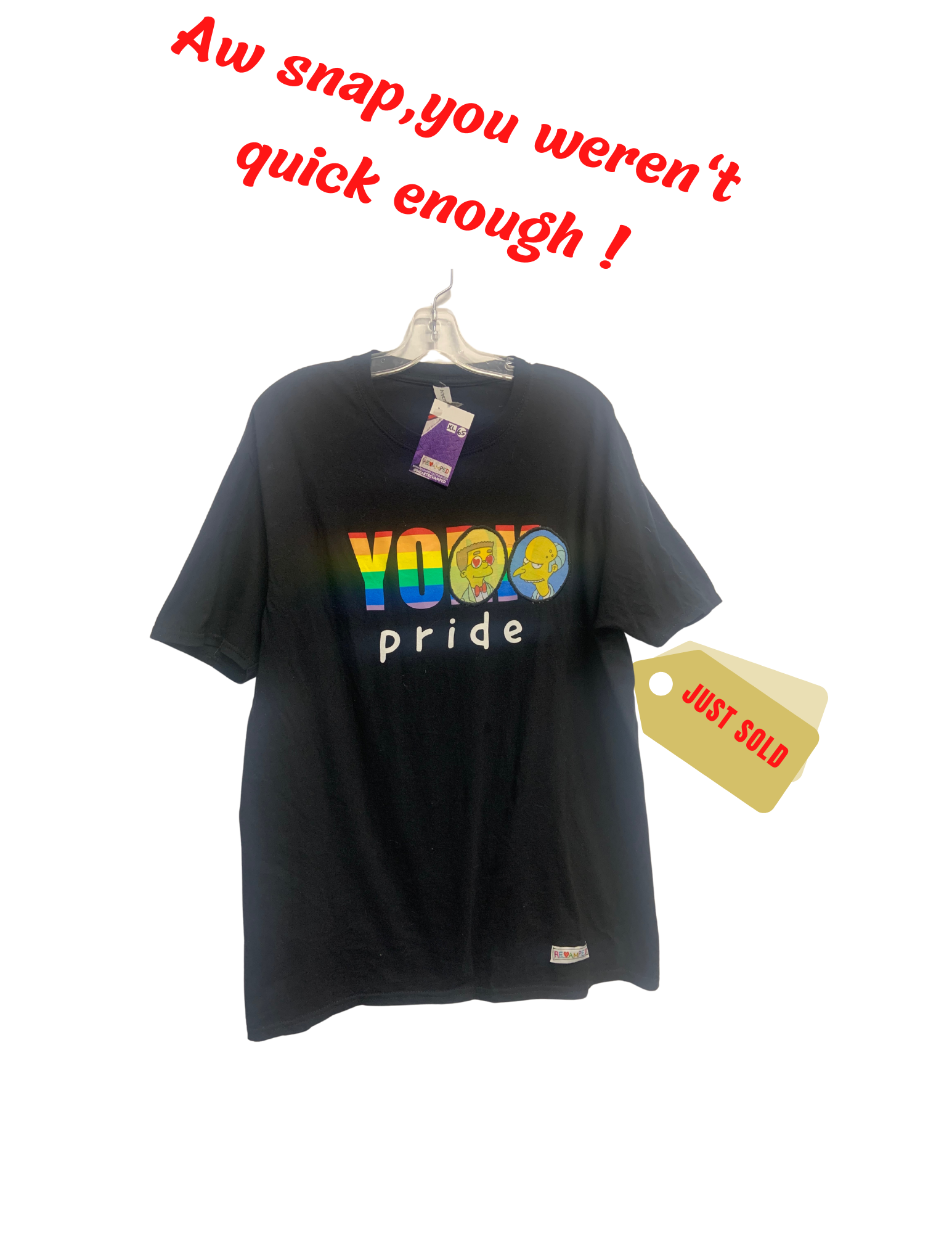 This one-of-a-kind XL tee celebrates Pride with a cheeky twist—featuring Mr. Burns and a love-struck Smithers, complete with heart eyes. “Yo PRIDE” blazes across the front in bold rainbow letters, making a playful and powerful statement. Handmade from vintage and recycled materials, this shirt is as sustainable as it is iconic.
